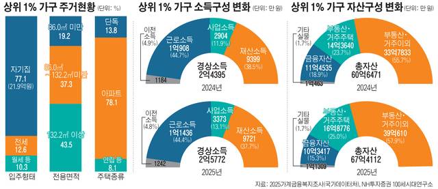 자산 구성 측면에서는 부동산 비중이 매우 높은 특징을 보인다. 상위 1% 가구의 평균 총자산은 약 67억 원으로 전년 대비 약 11% 증가했으며, 이 가운데 투자 목적의 부동산 비중이 57.9%로 가장 큰 비중을 차지했다. 거주 주택 역시 금액과 비중이 모두 증가했으며, 반면 금융자산 비중은 18.9%에서 15.3%로 감소해 상대적으로 축소되는 흐름을 보였다. 이는 자산 증식 과정에서 금융자산보다 부동산 중심 전략이 강화되고 있음을 의미한다.