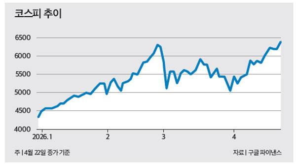 코스피가 4월 21일 6388.47, 22일 6417.93에 거래를 마치며 연이어 사상 최고치를 경신했다(그래프 참조). SK하이닉스도 '120만닉스' 고지를 밟아 신고가를 썼다. 종전 협상 불확실성에도 삼성전자를 시작으로 국내 기업의 실적 서프라이즈가 잇달아 발표되면서 투자심리가 되살아나는 모양새다. 4월 21일 염승환 LS증권 리테일사업부 이사를 만나 코스피가 두드러진 회복력을 보이는 배경과 반도체 투 톱 삼성전자와 SK하이닉스의 주가가 지금 가장 싸다고 말하는 이유 등에 관해 물었다.