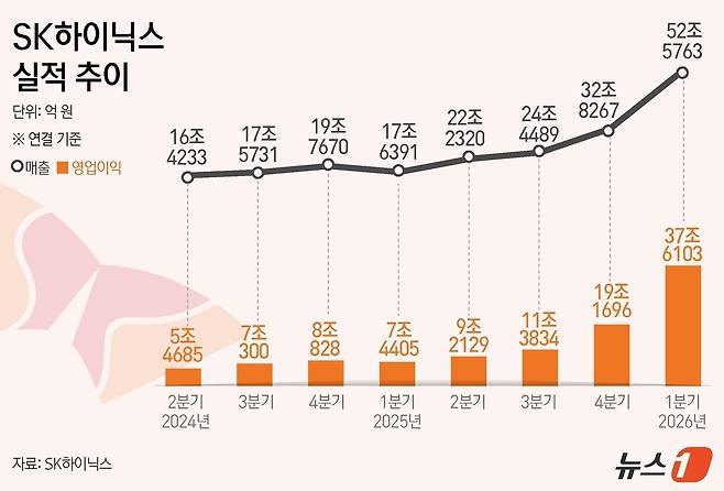 (서울=뉴스1) 윤주희 디자이너 = SK하이닉스는 23일 올해 1분기 영업이익이 37조 6103억 원을 기록했다고 공시했다. 이는 전년 동기 대비 405.5% 성장한 것으로 '역대 최대' 규모다. 지난해 2분기부터 4개 분기 연속 최고 실적 행진을 이어갔다. 같은 기간 매출은 52조 5763억 원으로 전년 동기에 비해 198.1% 급증했다.