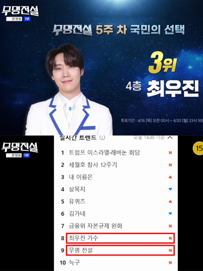 시청자들에게 강한 인상도 남겼다. 최우진은 ‘무명전설’ 대국민 투표 5주차 투표에서 3위를 기록하며 마지막까지 존재감을 확실히 각인시켰다. 이는 단순한 순위를 넘어, 그의 진정성과 무대를 향한 태도가 시청자들의 공감과 지지를 이끌어냈음을 보여주는 결과였다.