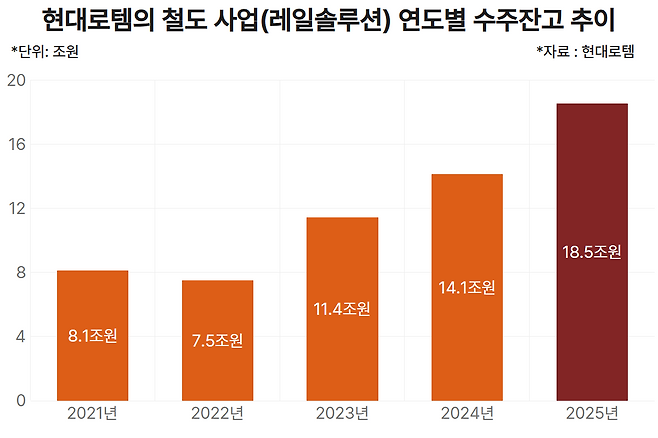 이 같은 흐름은 수주잔고 증가로 이어지고 있다. 현대로템의 수주잔고는 2022년까지 8조원 미만에 머물렀지만, 2023년 11조4000억원, 2024년 14조1000억원, 지난해에는 18조5000억원까지 확대됐다. 확보된 일감이 빠르게 늘어나며 중장기 실적 안정성이 한층 강화됐다는 평가다.
