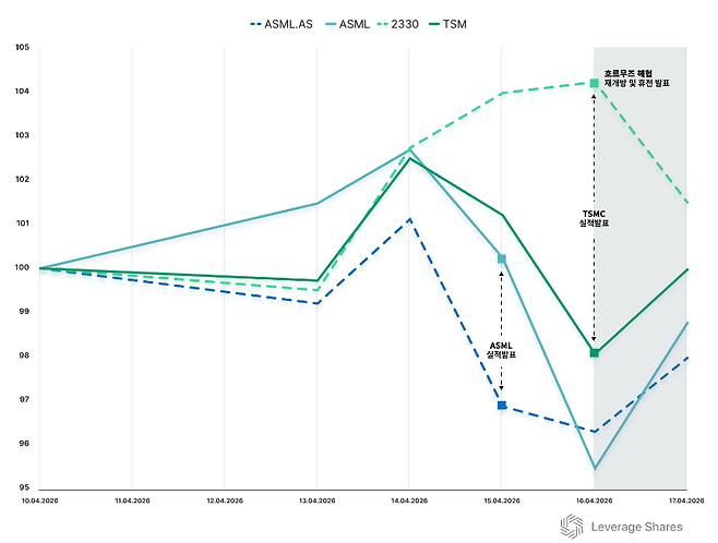실적 발표 이후에는 ASML 쪽이 글로벌 성장과 광범위한 경기 전망에 대한 시장 시각을 상당 부분 확인하는 흐름을 보였다. TSMC의 경우에는 미국 시장에서 전 거래일에 암시됐던 조정 전망을 대만 본토 상장 주가가 더 즉각적으로 반영했다. TSMC의 미국 상장 주식은 4월 17일 미국 시장 개장 직전, 그리고 아시아 시장 마감 직후 호르무즈 해협 휴전 발표가 나오자 반등했다. ASML 역시 같은 날 전체 시장과 함께 되올랐다. 그러나 주말 사이 협상은 빠르게 결렬됐고, 이 “안도 랠리”는 모든 티커에서 거의 지워질 위기에 놓였다. 동시에 추가적인 약세 불확실성까지 쌓일 수 있는 상황이 됐다.