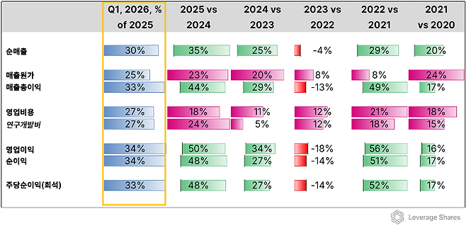한편 TSMC의 2026년 1분기는 현재 진행 중인 회계연도에 대해 매우 깔끔한 그림을 보여준다. 단 한 분기 만에 전 회계연도 매출의 3분의 1에 약간 못 미치는 수준을 달성했고, 매출원가와 영업비용은 현재 회계연도 초반 기준 대체로 평탄하게 움직이고 있다.