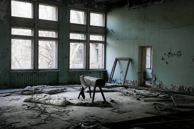 | ▲ 2017년 4월 5일, 우크라이나의 버려진 도시 프리피야트의 한 학교 체육관에 놓인 안마 기구. 이곳은 한때 인근 체르노빌 원자력 발전소와 관련된 삶을 살았던 사람들의 거주지였다. |