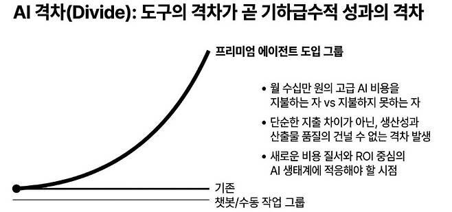 넷째, 'AI 격차'가 현실이 된다. 월 수십만 원을 내고 고급 AI 에이전트를 쓰는 팀과 그렇지 못한 팀 사이에는 생산성 차이가 기하급수적으로 벌어진다. 도구의 격차가 곧 성과의 격차가 되는 시대가 오고 있다.