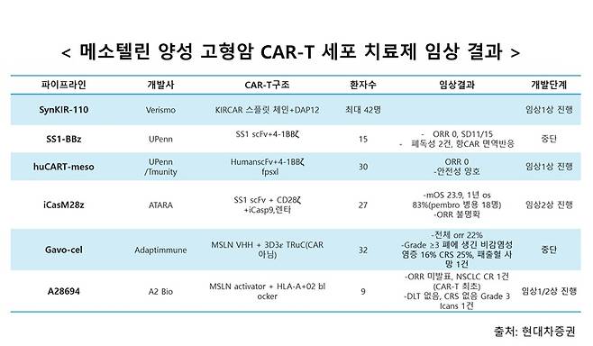 지난 10년간 메소텔린 양성 고형암을 겨냥한 CAR-T 세포치료제 개발은 꾸준히 시도돼 왔지만, 현재까지 유효성을 명확히 입증한 사례는 제한적인 수준이다. 일부 임상에서 항종양 반응이 보고되기도 했으나, 일관성과 재현성을 갖춘 의미있는 치료 성과로 이어진 경우는 아직까지 없는 것으로 평가된다.