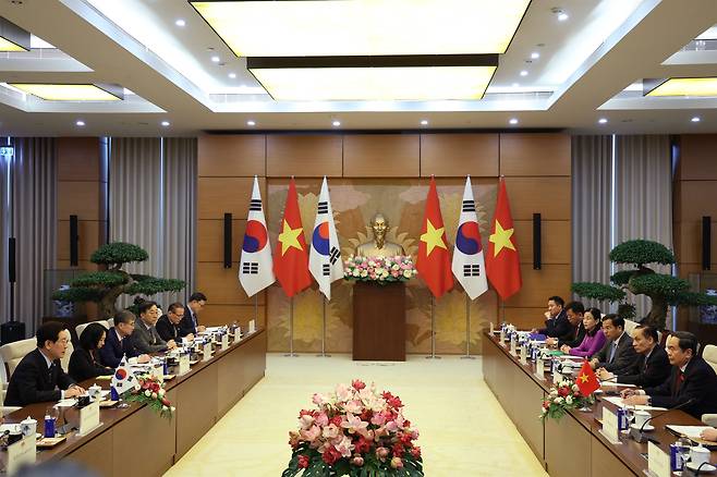 이 대통령은 베트남 국회의사당에서 열린 면담에서 수교 당시에 비해 현재 양국 간 교역액이 190배, 인적 교류가 2400배 증가한 점을 짚으면서 "국가 발전과 제도 정비를 이끄는 베트남 국회가 양국 관계 발전을 일관되게 지원해 준 덕분에 이러한 성과를 낼 수 있었다"고 평했다.
