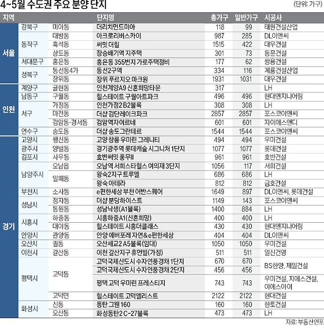 부동산 정보업체 부동산인포에 따르면 다음달까지 수도권에서 2만8189가구의 새 아파트가 공급된다. 이 중 2만1384가구가 일반분양된다. 지난달(6230가구)과 비교하면 3.4배 늘어난 수치다.