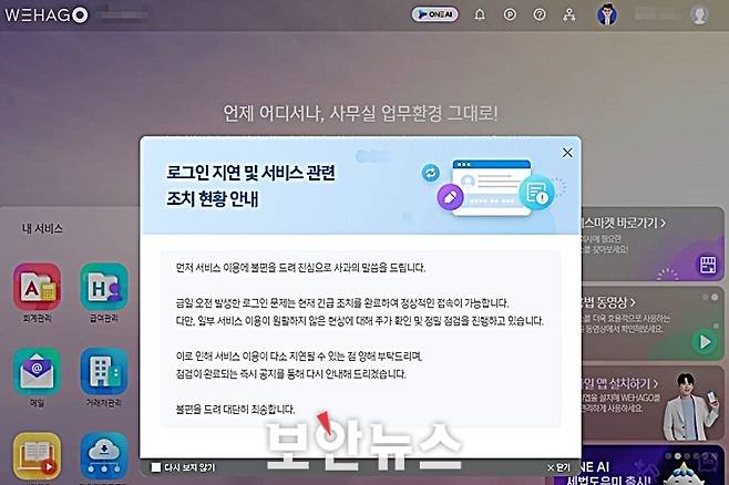 [보안뉴스 조재호 기자] 기업용 비즈니스 플랫폼인 더존비즈온의 ‘위하고’(WEHAGO)에서 대규모 접속 장애가 발생해 이용자들이 큰 불편을 겪고 있다. 부가가치세 신고 마감을 앞둔 시기에 전산망이 마비되면서 세무 회계 실무자들이 업무 차질을 호소하는 상황이다.