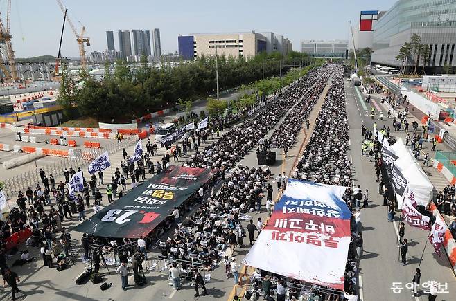 최승호 초기업노조 삼성전자지부 위원장이 이날 대형 차량에 올라 마이크를 잡자 함성이 터져 나왔다. 최 위원장은 “성과에 따른 정당한 보상으로 ‘인재 제일’ 원칙을 되살리겠다”며 “우리의 요구가 관철될 때까지 싸움을 멈추지 않을 것”이라고 말했다.