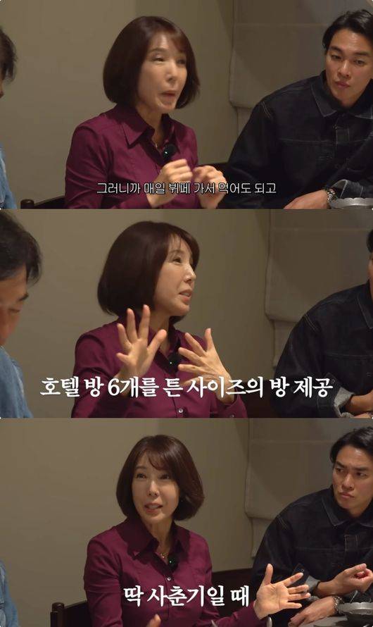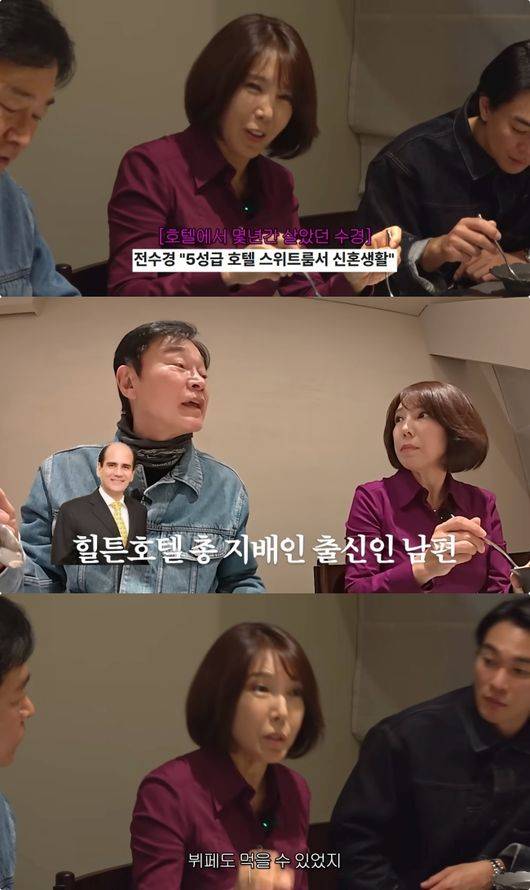 전수경은 당시 호텔 생활에 대해서 “그때만 해도 일식당, 유명한 프렌치 레스토랑도 있었고, 이탈리안 레스토랑도 따로 있었다. 뷔페도 먹을 수 있었다. 한식도 많고”라며, “그게 이제 총지배인 가족한테 어떤 바우처처럼 나온다. 충분하게 나온다. 그러니까 매일 뷔페 가서 먹어도 된다”라고 설명해 눈길을 끌었다.