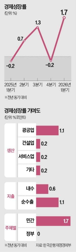 우려하던 중동 전쟁의 여파는 크지 않았다. 2월 28일 전쟁 발발 이후 3월 하순까지는 중동산 원유와 나프타를 싣고 호르무즈해협을 떠난 선박이 국내에 들어왔기 때문이다. 이 국장은 “1분기 90여 일 가운데 중동 전쟁의 영향이 나타난 것은 3월 하순의 열흘 정도”라며 “전쟁 발발 이후에도 반도체 등 수출은 계속 호조세를 이어갔고, 신용카드 사용액 등도 큰 영향을 받지 않았다”고 말했다. 작년 4분기 경제가 0.2% 역성장한 데 따른 기저효과가 작용했다는 분석도 있다.