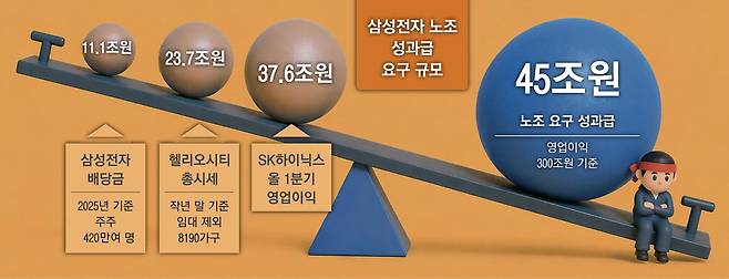 노조가 요구하는 성과급 45조원은 지난해 삼성전자 배당금(11조1000억원)의 4배에 달하는 금액이다. 또 작년 말 기준 국내 아파트 단지 중 시세 총액이 가장 컸던 헬리오시티(23조7000억원·임대 제외 8190가구)의 2배에 달한다. 또한 작년 서울시 본예산(48조원)에 필적하는 규모다.