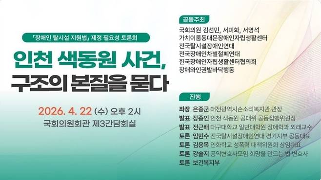 지난 22일 오후 2시, 국회의원회관 제3간담회실에서 열린 '인천 색동원 사건, 구조의 본질을 묻다' 토론회 현장은 한 탈시설 당사자의 떨리는 증언으로 숙연해졌다.