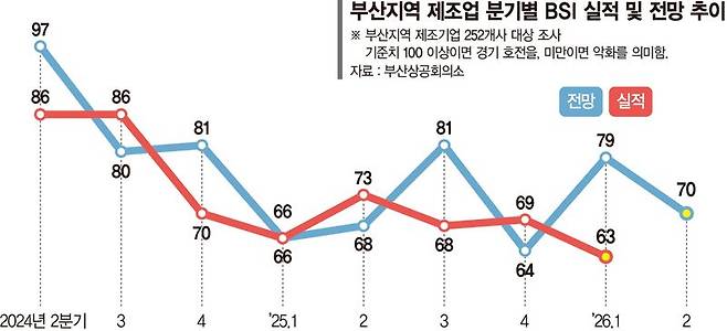 23일 부산상공회의소가 지역 제조업 252개사를 대상으로 실시한 '2026년 2분기 부산지역 제조업 경기전망지수(BSI) 조사'에 따르면 제조업 BSI는 70으로 전분기 대비 9p 하락했다. BSI는 기준치 100 이상이면 경기 호전을, 미만이면 악화를 의미한다.