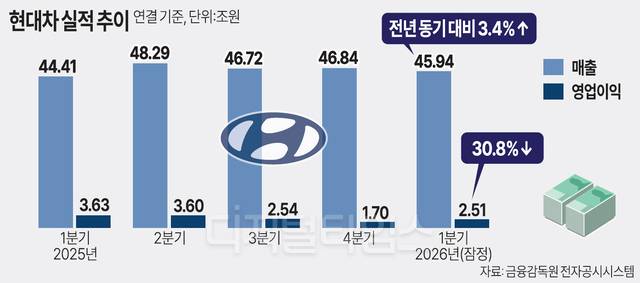 현대차는 23일 실적발표에서 올 1분기 영업이익이 2조5147억원을 기록해 작년 동기 대비 30.8% 감소했다고 밝혔다. 매출액은 45조9389억원으로 3.4% 늘었지만, 미국 트럼프 정부가 부과한 관세 8600억원에 중동전 발발에 따른 현지 판매 차질, 환율·원가 상승 영향이 복합적으로 작용해 수익성이 급감했다.