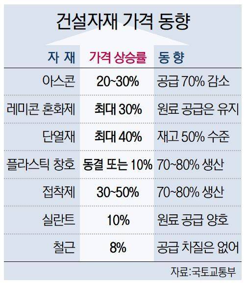 공사비 상승분을 현실화해 달라는 요구도 늘고 있다. 롯데건설은 최근 부산 대형 공사 현장의 시행사와 조합에 공문을 발송해 자재 수급 차질이 계속되면 공사비 인상이나 공사 기간 연장 협의를 적극 검토해 달라고 요청했다. 현대건설도 최근 발주처로 공문을 보내 원자재 가격 상승과 자재 공급 차질이 현실화하고 있다며 추가 공사비 반영을 요청했다.