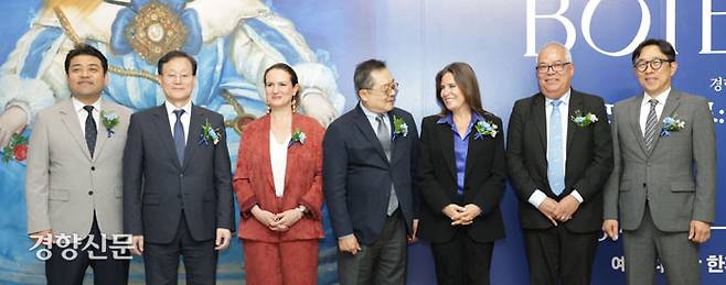 경향신문 창간 80주년 기념 ‘페르난도 보테로: 형태의 미학’ 개막식이 23일 서울 서초구 예술의전당 한가람디자인미술관에서 열렸다. 김세연 예술의전당 예술협력본부장, 박종성 경향신문 사장, 이올레 시에나 아르테미시아 최고경영자, 구자열 예술의전당 이사장, 리나 보테로 페르난도보테로재단 공동 디렉터, 요바니 벨라스케스 킨테로 주한 콜롬비아대사, 강욱 씨씨오씨 대표(왼쪽부터)가 기념촬영을 하고 있다.