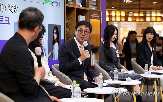 (서울=연합뉴스) 최휘영 문화체육관광부 장관이 23일 서울 강남구 코엑스 별마당도서관에서 열린 대국민 독서 캠페인 '2026 책 읽는 대한민국' 선포식에서 참석자들과 북토크를 하고 있다. 2026.4.23 [문화체육관광부 제공. 재판매 및 DB 금지]
