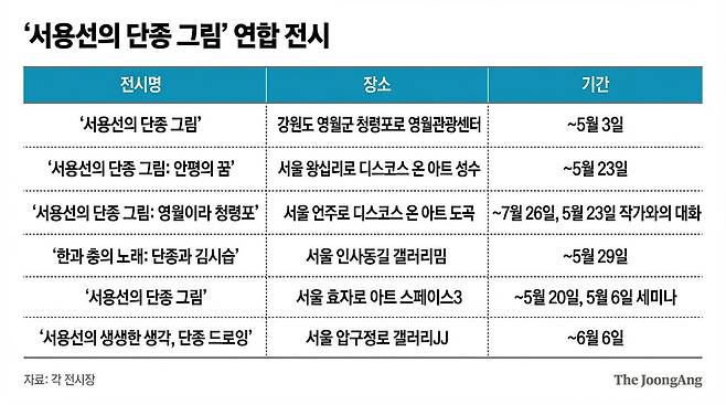‘그림 인문학자’ 서용선 전 서울대 서양화과 교수의 단종 그림 연합 전시가 강원도 영월 청령포 인근 영월관광센터와 서울의 디스코스 온 아트 성수·도곡, 갤러리밈, 아트 스페이스3, 갤러리JJ 등 6곳에서 열리고 있다. 단종을 그린 지 40년을 맞아 책 『서용선의 단종 그림』 『서용선의 단종 그림, 영월』 『서용선 작업 노트: 사람의 도시』(연립서가)도 나왔다. 1600만 관객을 넘긴 영화 ‘왕과 사는 남자’ 이전인 지난해 봄부터 정영목 서울대 명예교수가 기획했다.