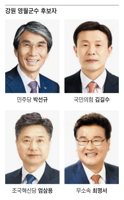 6월 3일 열리는 강원 영월군수 선거는 ‘4선 군수’ 탄생 여부와 보수 표심 분열 여부로 주목받고 있다. 국민의힘 소속으로 3선을 지낸 박선규(69) 전 군수가 더불어민주당으로 옮겨 4선에 도전하고, 국민의힘에서 ‘컷오프(공천 배제)’된 최명서(70) 현 군수는 무소속으로 출마했다. 국민의힘 공천을 받은 인물은 김길수(66) 강원도의원이다. 조국혁신당 엄삼용(59) 한강유역물관리위원회 거버넌스 분과장도 출마해 4파전으로 치러진다.
