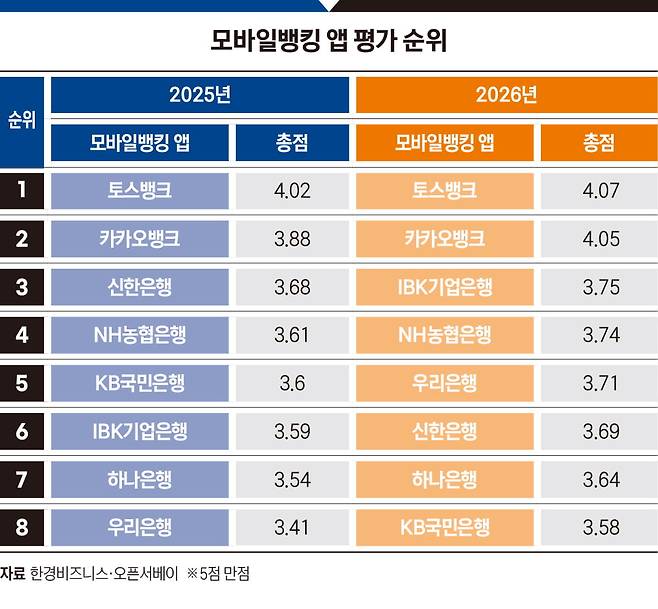 한경비즈니스는 2018년부터 모바일뱅킹 앱의 경쟁력을 분석하는 설문조사를 실시해 왔다. 2022년 인터넷전문은행을 포함해 조사 대상을 넓힌데 이어 2024년부터는 시중은행과 인터넷은행을 동일 기준으로 평가해 통합 순위를 산출하고 있다. 디지털 경쟁력을 앞세운 인터넷은행과 이를 추격하는 시중은행 간 격차도 빠르게 좁혀지는 추세다.