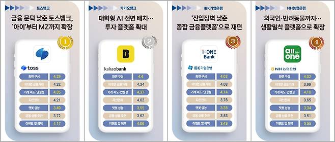 전통 은행도 빠르게 격차를 좁히고 있다. IBK기업은행의 추격이 두드러졌다. ‘아이원뱅크’는 총점 3.75점을 기록하며 전통 은행 가운데 가장 높은 평가를 받았다. 전체 순위는 3위로 토스뱅크, 카카오뱅크와의 점수 차는 각각 0.32점, 0.30점에 그쳤다. 인터넷은행과의 격차가 역대 가장 좁혀진 것이다. 특히 기업은행은 지난해 6위에서 올해 3위로 세 계단 뛰어오르며 상승세를 보였다.