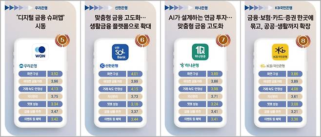 지난해 꼴찌를 기록했던 우리은행은 괄목할 만한 반등을 보였다. ‘우리원뱅크’는 총점 3.71점을 기록하며 종합 5위에 올랐고 전통 은행 가운데서는 3위를 차지했다. 특히 거래 속도·안정성 부문에서 4.13점을 받으며 전체 점수를 끌어올렸다. 지난해 부진했던 챗봇 성능과 금융상품 추천 점수도 각각 3.34점, 3.47점으로 상승하며 개선된 모습을 보였다. 우리은행은 2015년 5월 국내 최초 모바일뱅킹 앱 ‘위비뱅크’를 선보인 바 있다.