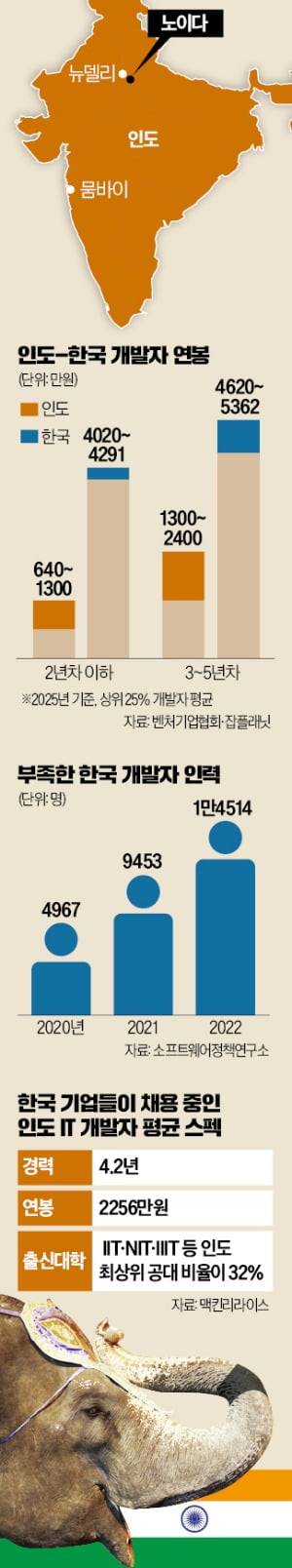한국 기업은 비용 측면에서도 매력을 느낄 수밖에 없다. 벤처기업협회에 따르면 인도의 미들급(3~5년 차) 상위 25% 개발자의 평균 연봉은 1300만~2400만원 선으로 국내의 3분의 1 수준이다. 맥킨리라이스가 노이다개발센터에서 고용 중인 인도 개발자의 평균 월급은 약 188만원이다. 현지 공대 졸업생이 받을 수 있는 임금인 30만~50만원 선보다 훨씬 많다.