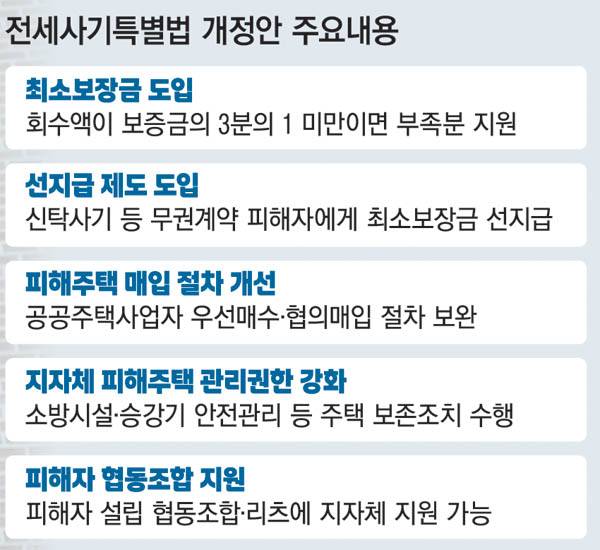 개정안 핵심은 ‘최소보장제’ 도입이다. 피해자가 경·공매 차익과 보증금 반환채권 회수액 등을 합해 돌려받은 금액이 임차보증금의 3분의 1에 미치지 못하면 부족분을 재정으로 지원키로 했다. 신탁사기 등 무권계약 피해자에게는 복잡한 경·공매 절차에 앞서 최소보장금 일부를 먼저 지급한 뒤 사후 정산하는 ‘선지급·후정산’ 제도도 담겼다. 피해주택 매입 절차 개선과 지자체 관리 권한 강화 방안도 포함됐다.