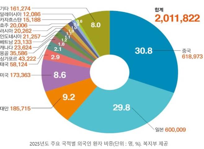 국적별로는 중국과 일본의 비중이 압도적이었다. 중국인 환자가 전체의 30.8%인 약 62만명으로 가장 많았고, 일본이 29.8%로 뒤를 이었다.