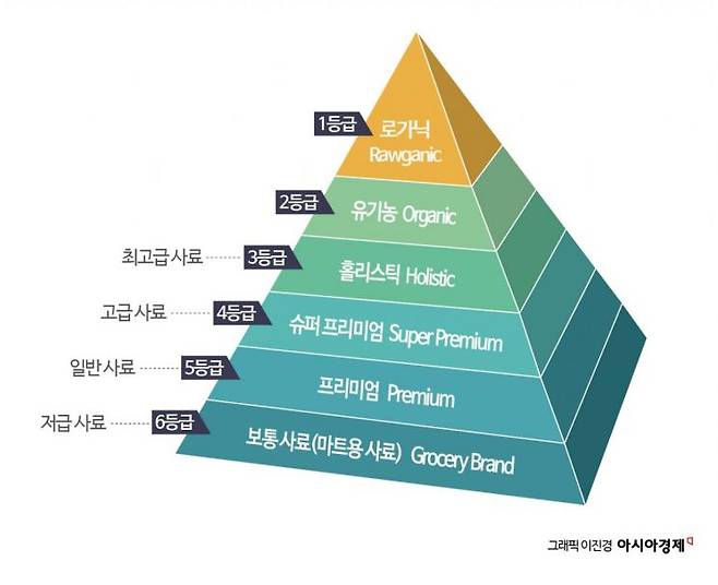 반려견 사료는 일반적으로 6단계 품질 등급으로 구분된다. 가장 높은 단계는 '로가닉(Rawganic)'이다. 원재료를 거의 가공하지 않은 생식 또는 화식 개념으로, 영양소 파괴가 가장 적다. 이어 유기농(Organic), 홀리스틱(Holistic), 슈퍼 프리미엄 순으로 이어진다. 등급이 내려갈수록 가공 비중이 높아지고 곡물이나 부산물 사용이 늘어난다.