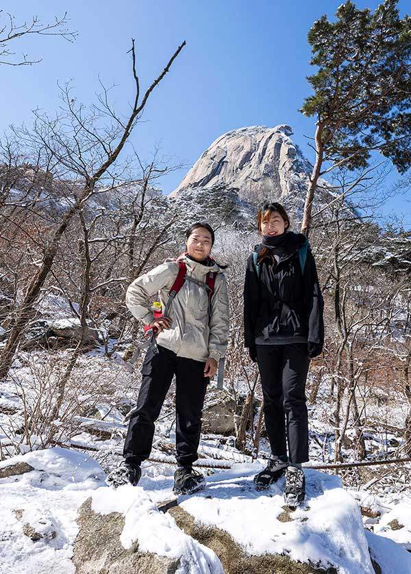 충북산악연맹에서 봄맞이 암벽 등반을 위해 북한산을 찾았다. 눈 때문에 원래 계획했던 '비둘기길' 등반은 포기하고 백운대를 오르기로 했다. 머리 위로 솟은 배낭 높이에서 예사롭지 않은 구력이 느껴진다. 자일과 등반 장비가 들어 있는 38L 중대형 배낭은 그 무게만도 상당하다. 수빈씨는 밝은 베이지색 바람막이에 일상복으로도 활용 가능한 얇은 기능성 바지를 입었다. 그 안에 레깅스를 겹쳐 입어 방한 대비를 했다. 현주씨는 차분한 검은색 옷차림에 청록색 배낭으로 시원한 포인트를 주었다. 둘의 야무진 준비성과 젊은 산꾼다운 든든한 스타일이 돋보인다.