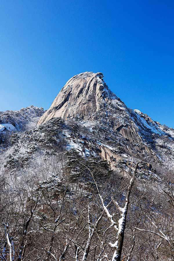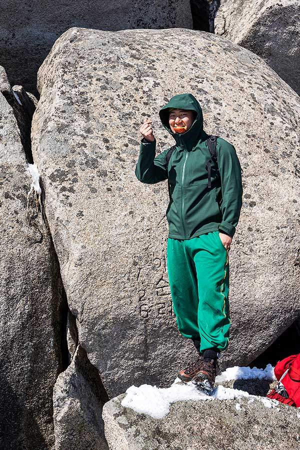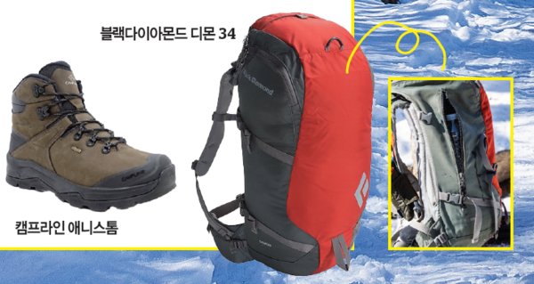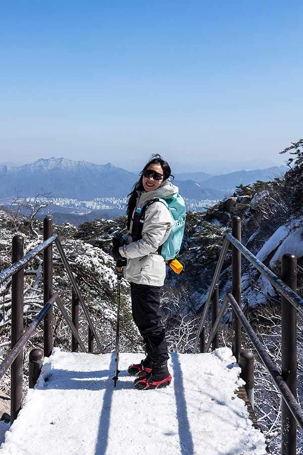 백운대피소를 지나 이어지는 계단길에서 사진을 찍고 있는 한 커플을 마주쳤다. 채란씨는 오랜만에 남자친구와 함께 북한산을 찾았다. 흰색의 재킷이 하얀 설산과 잘 어울린다. 가장 아끼는 '도이터' 배낭은 원래 트레일러닝용으로 나온 조끼 형태의 제품이다. 조끼형 배낭 앞쪽에 물병을 넣고 수시로 마실 수 있어 산행에도 유용하게 쓰고 있다. 배낭의 화사한 민트색은 전체적인 코디에 싱그러운 활기를 더해 준다. 무겁게 차려입기보다 가벼운 장비들을 적절히 조합한 덕분에 산속의 시원한 공기가 느껴지는 듯 경쾌한 차림이 완성됐다.