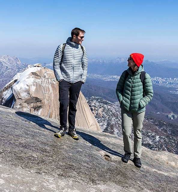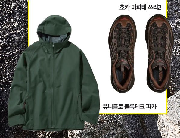 서울로 6박7일 여행을 온 스코틀랜드·영국 출신의 커플을 만났다. 헤더는 초록빛 경량 패딩과 베이지톤의 바지로 산의 색감과 어울리는 패션을 보여 주었다. 그녀가 가진 대부분의 장비는 '마운틴웨어하우스' 제품이었다. 맷은 무릎 부분에 지퍼가 있어 반바지로도 입을 수 있는 바지와 주먹만 하게 접히는 '데카트론' 배낭을 메고 있었다. 두 사람은 맷이 먼저 신고 추천한 '살로몬' 신발을 함께 신었다. 둘은 비슷한 느낌의 경량 패딩과 차분한 색감을 활용해 감각적인 시밀러룩을 완성했다. 꾸미지 않은 듯하지만 장비의 기능은 확실히 챙긴 고수의 향기가 난다.