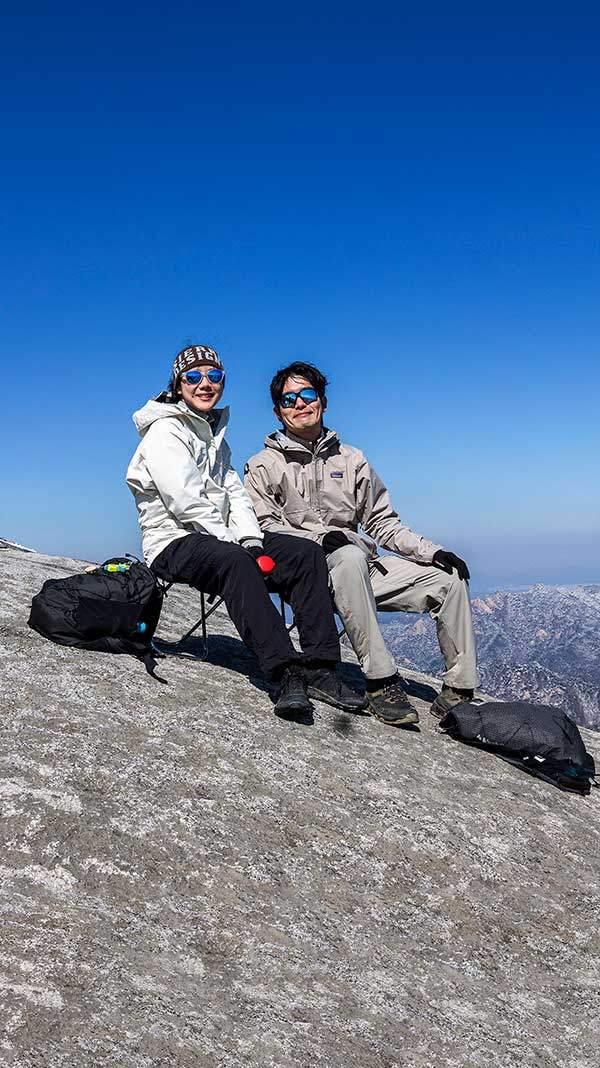 너른 바위 위에 접이식 의자를 펴고 샌드위치를 즐기던 이들은 한 달에 두 번 이상 산을 찾는 산행 마니아 부부다. 백운대 방문은 벌써 네 번째다. 아내 보람씨는 블랙 앤 화이트 코디에 갈색 헤어밴드를 착용해 세련된 포인트를 주었다. 남편 동선씨는 바람막이와 바지 모두 차분한 베이지 톤으로 맞춰 입었다. 평소 아웃도어 브랜드 '파타고니아'를 좋아한다는 부부의 취향이 고스란히 묻어난다. 너무 튀지 않으면서도 세련된 색 조합으로 자연스러운 멋을 보여 준 커플룩이다.