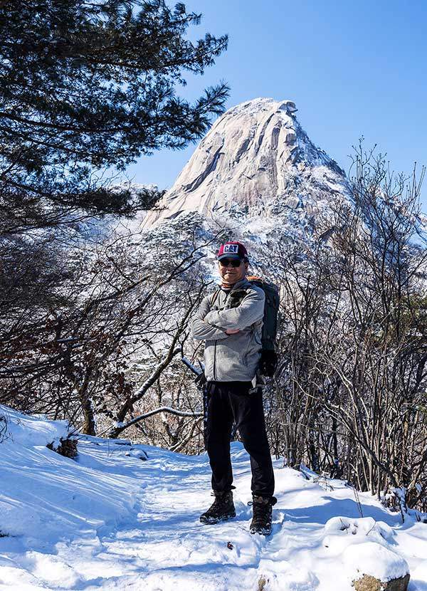 대학 동기들과 함께 생애 첫 북한산 산행에 나섰다. 아이젠을 못 챙겨와 애를 먹었지만, 친구들과 함께하니 이 또한 웃음 가득한 추억이 된다. 양성재씨는 바위산의 회색빛 사이에서 눈에 띄는 선명한 파란색 경량 패딩을 입었다. 검은 바지 위로 하얀 양말을 올려 신은 모습에서 남다른 감각이 느껴진다. 도심에서 패션용으로 신던 '로아' 등산화를 처음 산에서 개시했다. 전체적으로 젊은 나이답게 가볍고 경쾌한 느낌이 돋보이는 룩이다. 가장 아끼는 '클라터 뮤젠' 배낭은 무거워서 함께 온 친구에게 잠시 넘겨주었다.