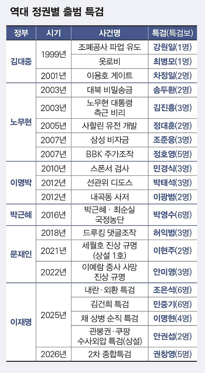 이재명 정부 출범과 함께 '특검 인플레이션'이 현실화했다. 정부가 출범한 지 1년도 안 돼 3대 특검과 상설 특검에 이어 2차 종합특검까지 5개의 특검이 만들어졌다. 여기에 더해 집권여당인 더불어민주당은 '조작 기소 특검' 가능성을 또 예고하고 나섰다. 대한민국의 역대 특검들은 이렇듯 전례 없이 연이어 전개되고 있는 특검 정국 상황을 어떻게 바라보고 있을까.