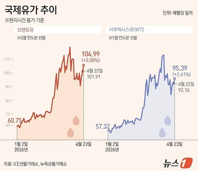 (서울=뉴스1) 윤주희 디자이너 = 23일(현지시간) 국제유가가 3%대 상승세를 나타냈다. 이란 테헤란 상공 공습 보도와 이란 내부의 유력 지도자 사이 권력 투쟁 소식으로 유가는 다시 한번 요동쳤다.