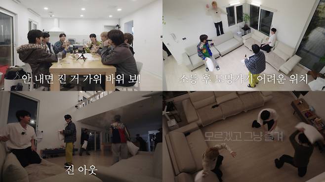 식사 후 뒷정리를 걸고 진행된 ‘좀비 게임’은 현장을 아수라장으로 만들었다. 좀비가 된 멤버들은 안대로 눈을 가린 채 엉거주춤한 자세로 시민을 찾아 나섰고 ‘월드스타’의 카리스마를 내려놓고 처절한 몸개그를 선보였다. 앞이 보이지 않는 상황에서 시민을 잡기 위해 고군분투하다가 급기야 서로 엉겨 붙어 베개 싸움을 벌이기에 이르렀다. 게임이 끝나자 이들은 “너무 웃어서 광대 아프다”라며 아이처럼 천진난만하게 웃음을 터뜨렸다.