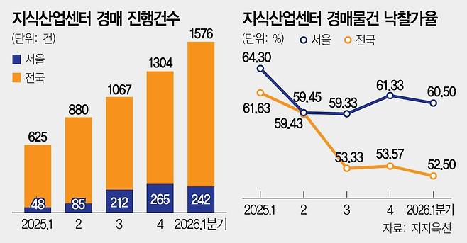 지식산업센터가 경매 시장에서도 외면받고 있다. 올해 1분기 경매 물건이 늘어난 반면 낙찰가율은 52%대까지 떨어졌다. 정부가 입주 업종 확대와 한국토지주택공사(LH) 매입 카드를 꺼냈지만 효과는 제한적이라는 평가가 지배적이다.