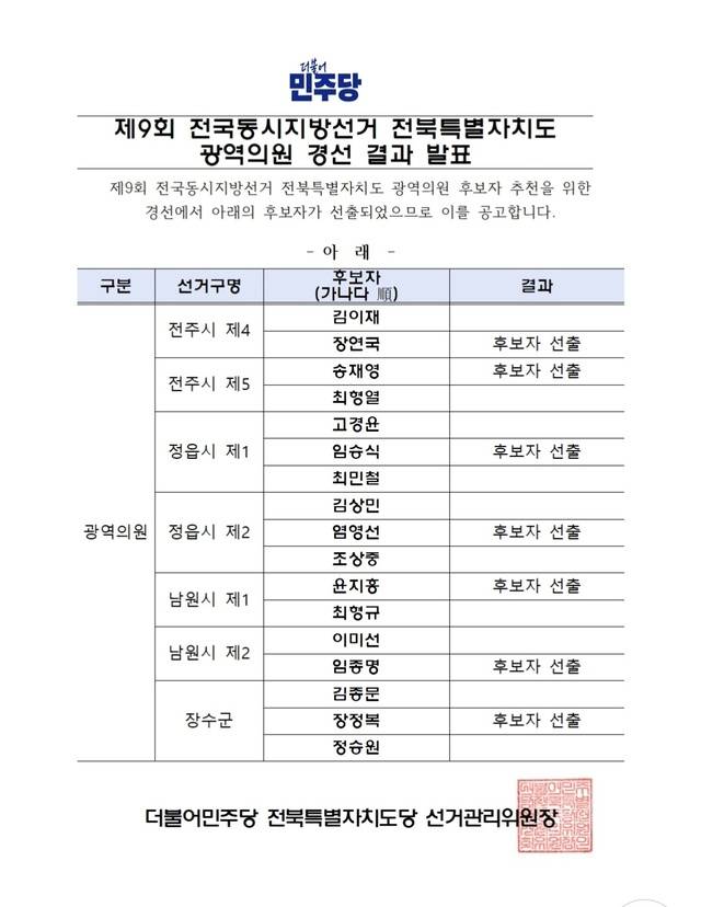 더불어민주당 전북특별자치도당 선거관리위원회(위원장 박영자)는 23일 전주와 정읍, 남원, 장수 등 4개 시·군, 7개 광역의원(도의원) 선거구에 대한 경선 결과를 발표하고 결과를 홈페이지에 공지했다.