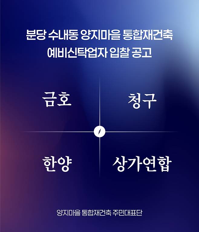 24일 성남시 분당구 수내동 양지마을(금호·청구·한양아파트, 상가연합) 통합재건축 주민대표단은 오전 10시쯤 나라장터에 새로운 예비신탁업자 선정을 위한 입찰 공고를 게시한다고 밝혔다. 이번 공고는 소유주들의 뜻을 반영해 공정하고 투명한 사업 파트너를 찾기 위한 조치다.