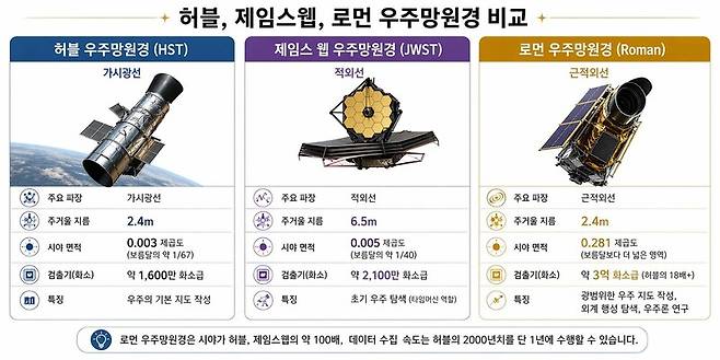 센서의 성능 차이도 크다. 허블의 센서는 1600만 화소급이지만 로먼은 그 18배가 넘는 약 3억 화소급이다. 단순히 면적만 넓어진 게 아니라 훨씬 정밀한 '눈'을 가졌다. 따라서 로먼 사진 한 장에는 허블 사진 200배 분량의 방대한 이미지 정보가 담긴다.