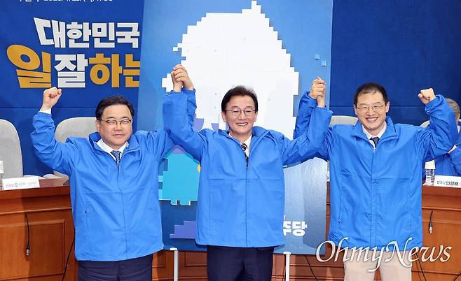 | ▲ 필승 다짐하는 민주당 부울경 후보들 더불어민주당 김경수 경남도지사 후보 대신 참석한 허성무 경남도당위원장(왼쪽부터), 전재수 부산시장 후보, 김상욱 울산시장 후보가 지난 23일 서울 여의도 국회에서 열린 민주당 광역단체장 후보 연석회의에 참석해 필승을 다짐하고 있다. |