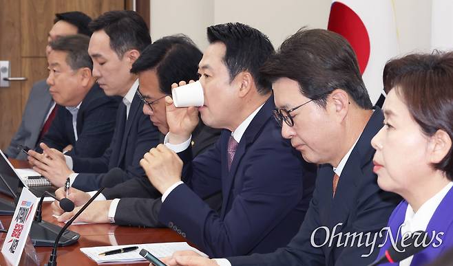 | ▲ 장동혁 국민의힘 대표가 지난 23일 서울 여의도 국회에서 열린 최고위원회의에서 최고위원의 발언을 들으며 물을 마시고 있다. 맨 오른쪽은 양향자 최고위원. |