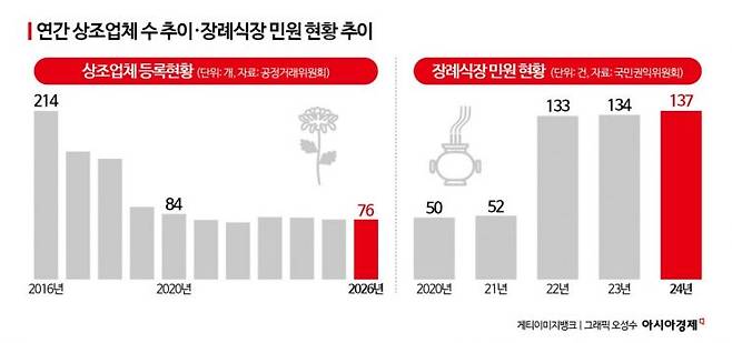 장례 과정에서 비용이 불어나는 배경에는 업계의 구조적 불황이 자리 잡고 있다. 공정거래위원회에 따르면 상조업체는 2016년 214곳에서 코로나19 시기를 거치며 급감한 뒤 올해 76곳으로 줄었다. 상조업계 관계자는 "최소 인건비와 기본 용품을 고려하면 무빈소 장례여도 최종 금액은 250만~300만원 수준이 정상적"이라며 "업체 간 경쟁이 과열되면서 현실성 없는 초저가 광고로 유족을 유인한 뒤 현장에서 옵션 판매로 이익을 남기는 행태가 만연해 있다"고 전했다.