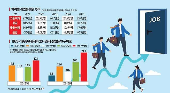 특히 청년실업이 심각하다. 구직활동을 하지 않는 20대 중후반 '쉬었음 청년'은 20년 사이 2.6배 늘었다(한국경영자총연합회 4월20일 보고서). 지난 2월 25~29세 취업자는 234만6000명으로 9년 만에 가장 적다. 주된 원인으로는 경력직 채용 증가, 전문 서비스업 채용 감소, 정년 60세 의무화, 저성장 고착화에 따른 고용 창출력 저하, 그리고 청년층의 대기업 선호가 꼽힌다. 이 가운데 경력직 채용 증가와 전문서비스업 채용 감소엔 AI가 영향을 미쳤을 가능성이 크다.