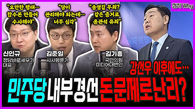 [정치 Why] 민주당 내부경선 돈 문제로 난리? (김준일) “당이 관리해야 되는데…너무 심각” (신인규) “오만한 행태…합수본 만들어 수사해야” (김기흥) “송영길 무죄? 같은 증거로 윤관석 유죄”