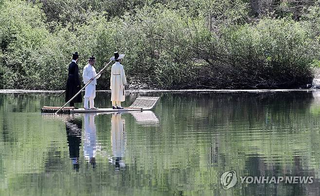 (영월=연합뉴스) 이재현 기자 = 제59회 단종문화제 첫날인 24일 영월군 청령포에서 조선 제6대 임금이자 비운의 왕 단종이 노산군(魯山君)으로 강봉된 채 나룻배를 타고 청령포로 들어가는 569년 전 단종유배길 행사가 재현됐다. 2026.4.24